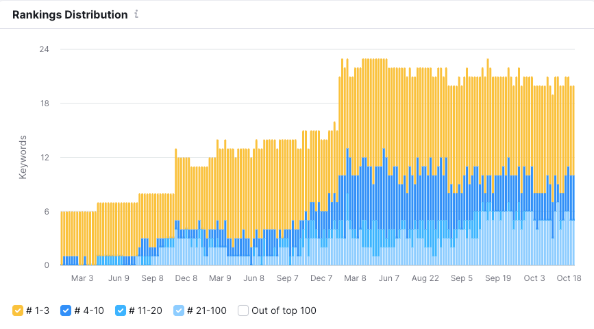 This graph shows the Wagner Machine website’s position on Google from March–October, with the volume of their website being ranked increasing over time.